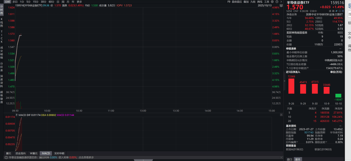 10月13日,受海外关税冲击影响,国内市场呈现普跌。而在盘面普跌之中,自主可控主线逆市上行,聚焦半导体设备领域的半导体设备ETF(159516)盘中拉升上涨超1.4%。资金持续加码,根据Wind数据,半导体设备ETF(159516)近10日净流入近40亿元。