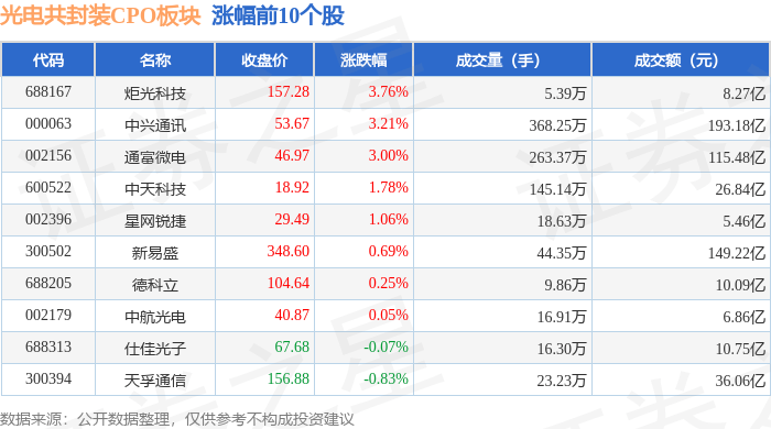 证券之星消息,10月13日光电共封装CPO板块较上一交易日下跌0.69%,源杰科技领跌。当日上证指数报收于3889.5,下跌0.19%。深证成指报收于13231.47,下跌0.93%。光电共封装CPO板块个股涨跌见下表: