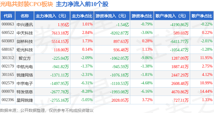 从资金流向上来看,当日光电共封装CPO板块主力资金净流出26.93亿元,游资资金净流入2.43亿元,散户资金净流入24.5亿元。光电共封装CPO板块个股资金流向见下表: