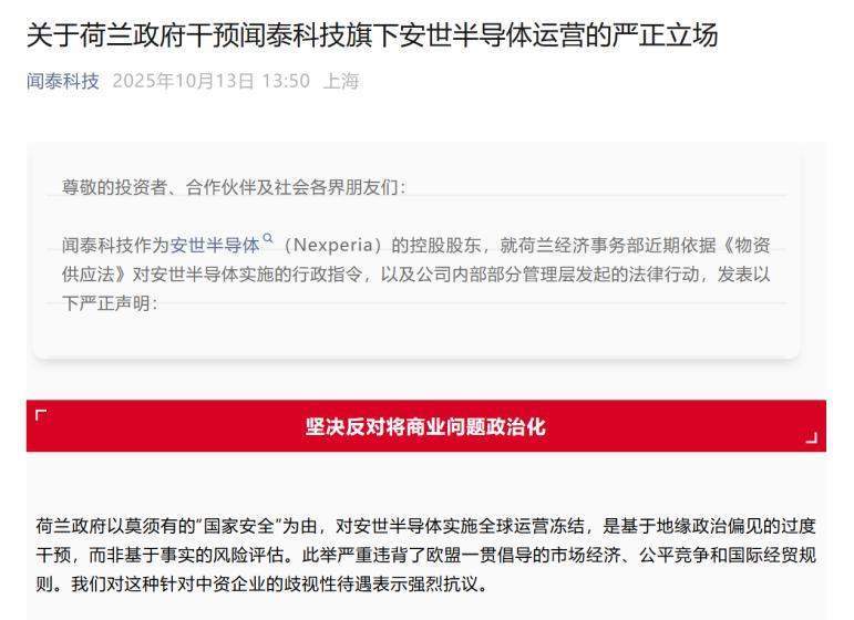闻泰科技表示,公司绝不会屈服于外部政治压力,已启动一切法律与外交途径,要求荷兰政府立即撤销错误指令;停止对中国企业的系统性歧视;维护全球半导体产业链的开放与合作。