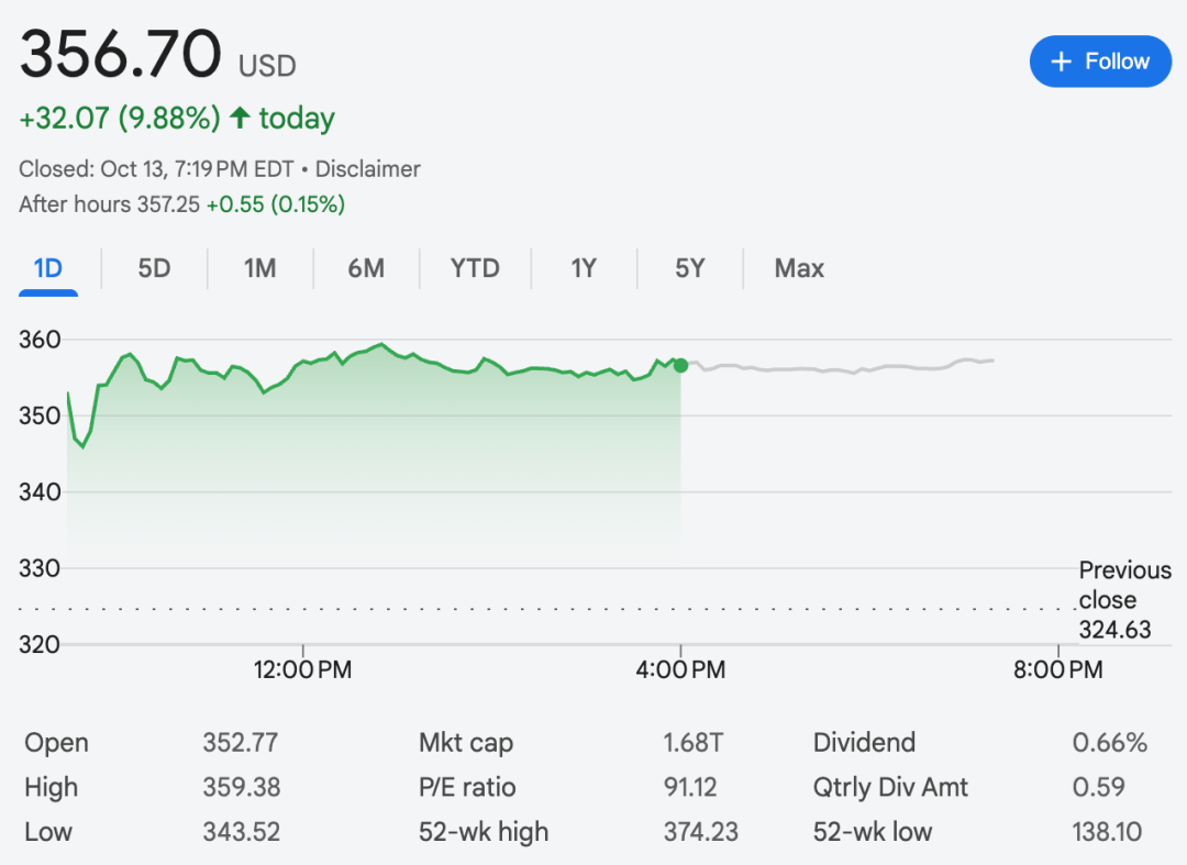 消息公布后,博通股价一度大涨近10%,市值达1.68万亿美元。