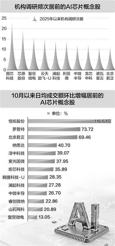 今年以来,多只AI芯片概念股频繁受到机构调研。据证券时报·数据宝统计,截至10月13日,今年以来合计有12只AI芯片概念股获得机构调研10次以上,包括国芯科技、芯原股份、复旦微电、云天励飞-U、澜起科技等。