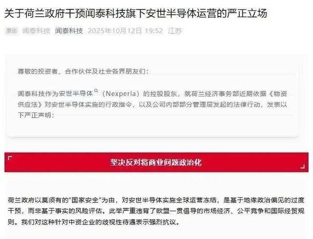 10月12日,闻泰科技发布公开声明,痛斥荷兰政府以莫须有的“国家安全”为由实施过度干预,宣布将聘请国际顶尖律所启动法律救济程序,同时主动对接中国政府部门寻求支持。