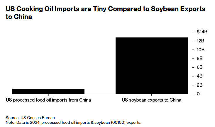 彭博社指出,与UCO相比,美国大豆贸易的价值要高得多。2024年大豆以245.8亿美元的出口额位居美国农产品出口首位,占农产品出口总额的14%。中国长期以来是美国大豆的最大买家,2024年从美国进口2213万吨大豆,价值约126亿美元。