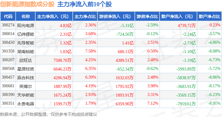 资金流向方面,创新能源(399266)指数成份股当日主力资金净流出合计22.17亿元,游资资金净流入合计11.98亿元,散户资金净流入合计10.19亿元。成份股资金流向详情见下表: