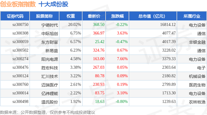 证券之星消息,10月16日,创业板指(399006)指数报收于3037.44点,涨0.38%,成交4775.59亿元,换手率3.38%。当日该指数成份股中,上涨的有34家,阳光电源以7.66%的涨幅领涨,下跌的有66家,金力永磁以5.24%的跌幅领跌。