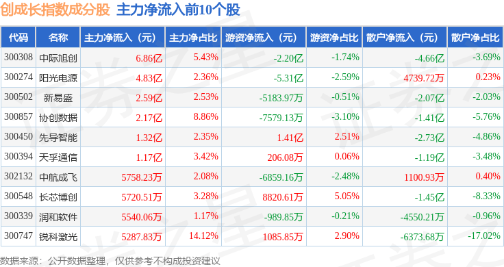 资金流向方面,创成长(399296)指数成份股当日主力资金净流出合计15.05亿元,游资资金净流入合计11.24亿元,散户资金净流入合计3.81亿元。成份股资金流向详情见下表: