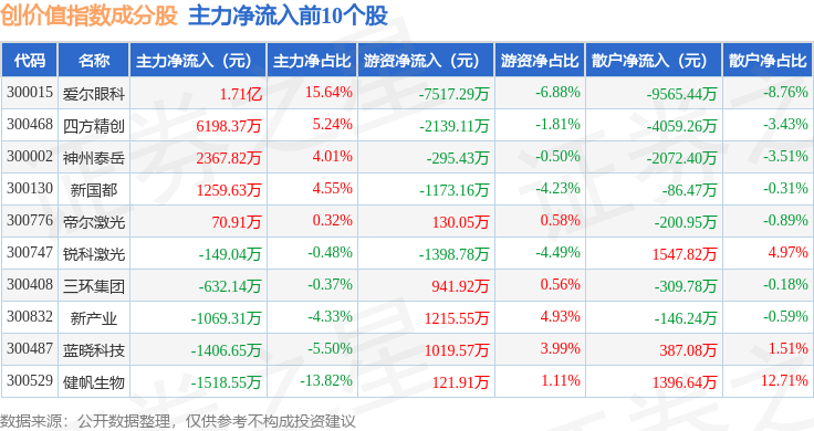 资金流向方面,创价值(399295)指数成份股当日主力资金净流出合计85.57亿元,游资资金净流入合计23.59亿元,散户资金净流入合计61.98亿元。成份股资金流向详情见下表:
