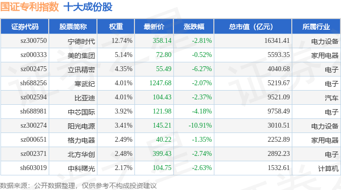 证券之星消息,10月17日,国证专利(980070)指数报收于3566.03点,跌3.37%,成交2148.66亿元,换手率1.47%。当日该指数成份股中,上涨的有4家,唯捷创芯以1.89%的涨幅领涨,下跌的有95家,阳光电源以10.91%的跌幅领跌。