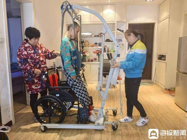 家人在设备的助力下把芳若从轮椅上拉起来。
