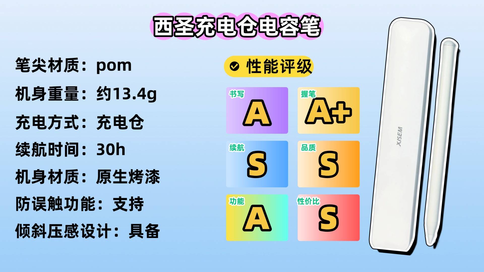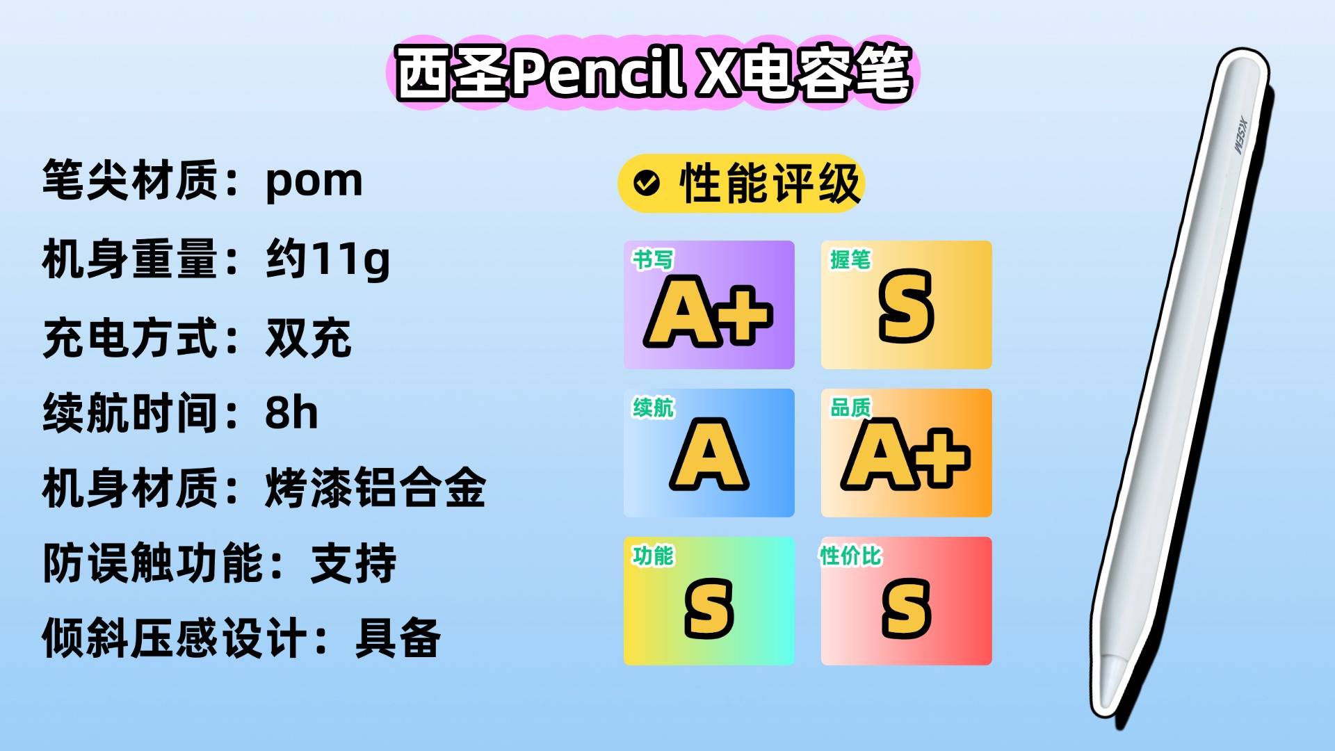 如果你很看重书写手感和整体性价比,我会推荐西圣Pencil X。一上线就被不少数码媒体喊成“apple pencil 平替电容笔天花板”!为什么?因为它把很多千元原装级才有的配置,拉到了百元级别,直接把平替电容笔市场卷出了天际。