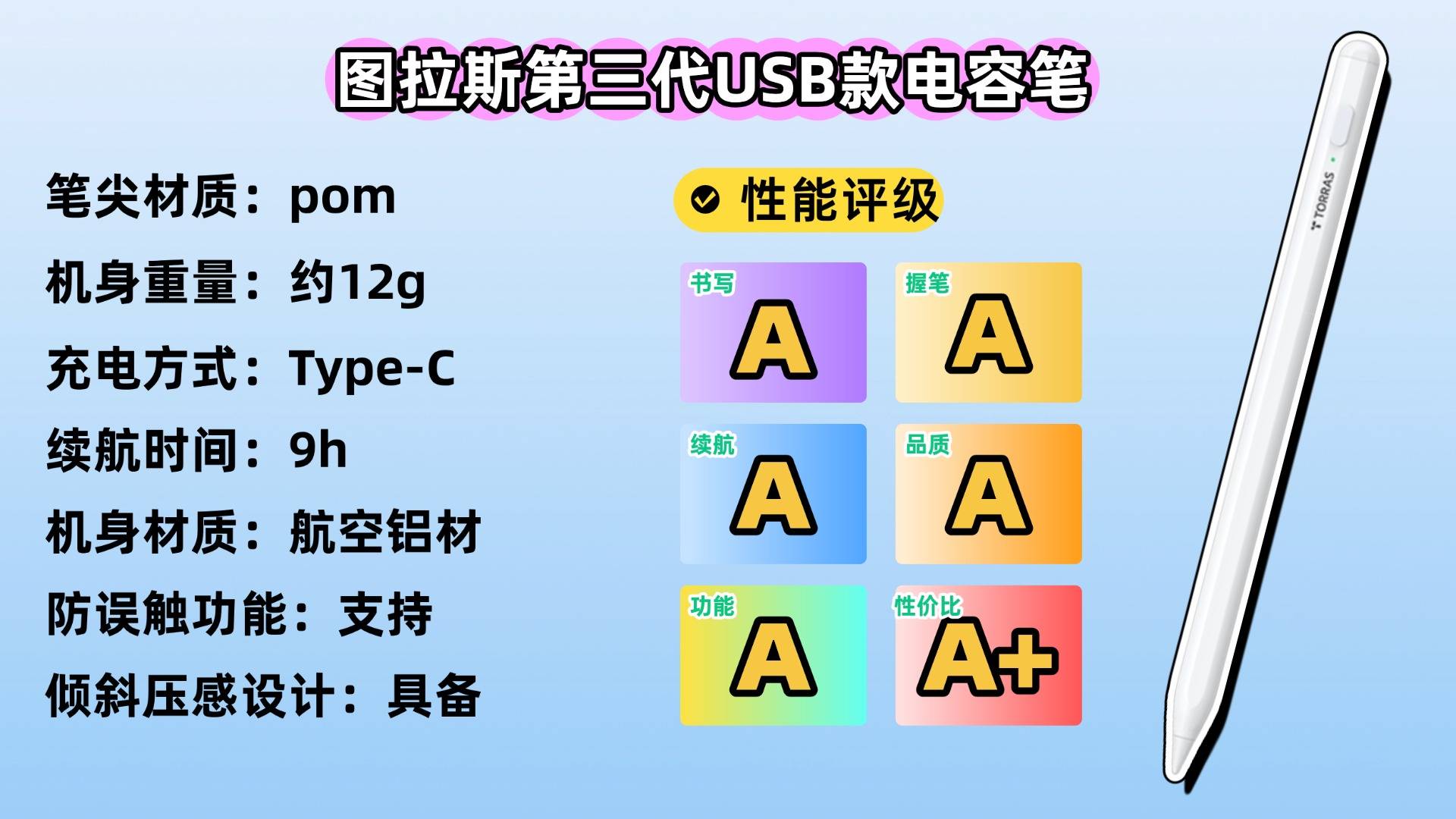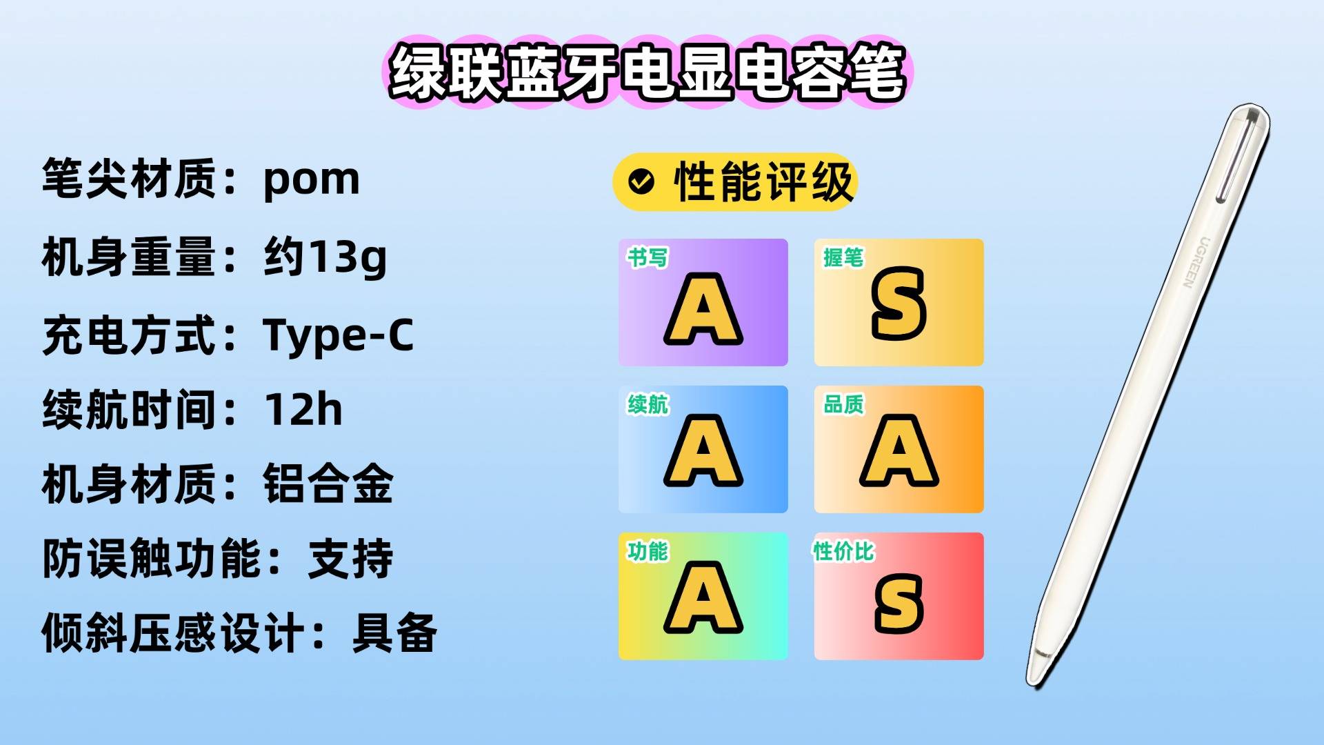 这款电容笔在外观上选用航空级铝合金材质打造,质感出众,同时将重量精准控制在约12克,轻盈便携,长时间使用也无负担。书写上,它的笔尖采用高耐磨的POM材质,书写细腻精准,即便是书写小字也能清晰流畅,还原度高,配合防误触技术,可在iPad上实现边写边支撑手掌的自然书写姿势,大幅提升使用体验。充电方面,它配备Type-C接口,支持快速充电,大约30分钟即可充满,满电后可连续使用约9小时,续航能力足以应对日常学习、办公或绘画需求。不过,相较于市面上多数平价替代产品,其价格略高,更适合追求品质与性能、预算较为充足的用户选择。