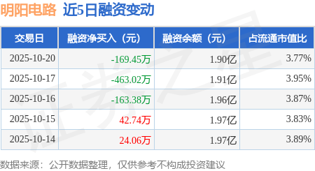 证券之星消息,10月20日,明阳电路(300739)融资买入1367.65万元,融资偿还1537.1万元,融资净卖出169.45万元,融资余额1.9亿元。