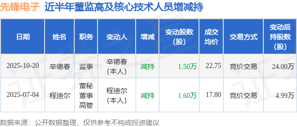 先锋电子近半年内的董监高及核心技术人员增减持详情如下: