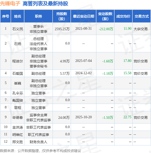 先锋电子的高管列表及最新持股情况如下: