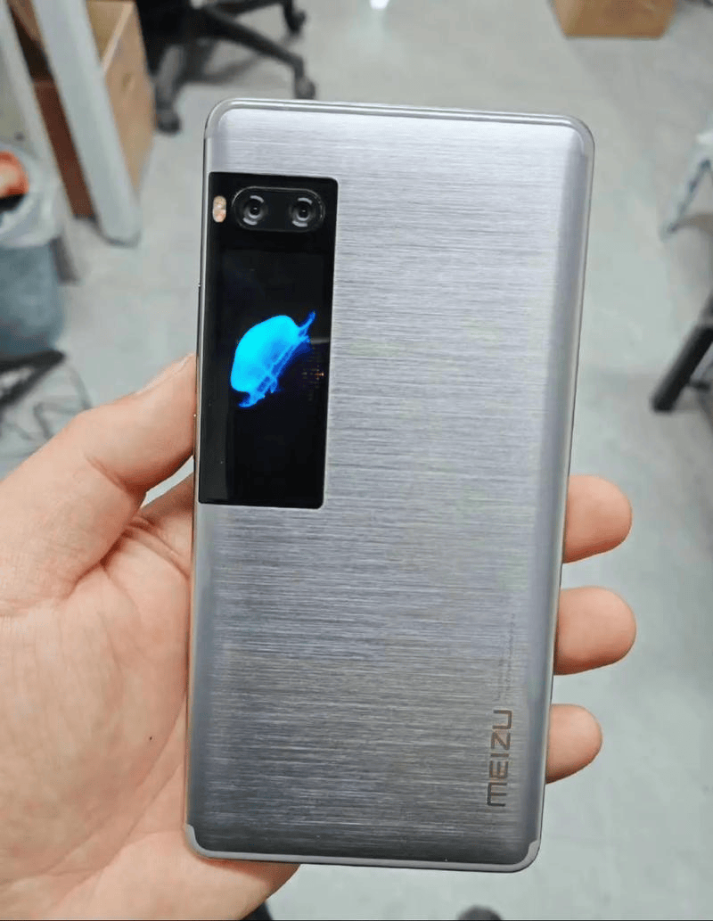 到了智能机时代,第一个吃背屏这只螃蟹的,是2017年发布的魅族Pro 7。它背部的画屏(Meizu See)是一块1.9英寸的AMOLED彩屏,理念堪称超前:双摄自拍预览、显示时间天气、充当MP3模式下的播放器。可它有点生不逢时。在全面屏浪潮刚刚掀起的2017年,这块画屏增加了成本和机身重量,但其交互深度和第三方应用生态却未能跟上。