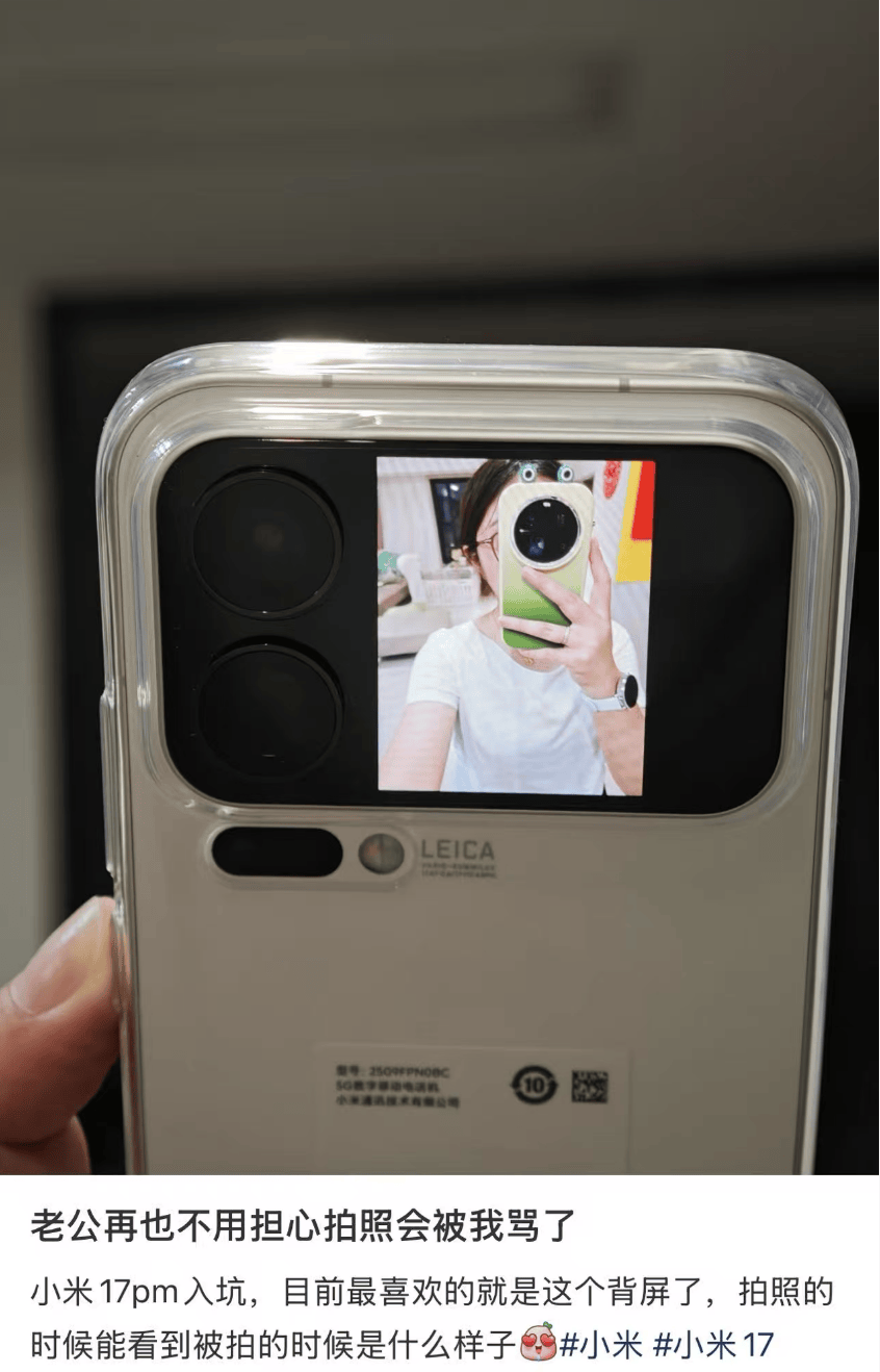 与此同时,对于另一些人来说,小米17的背屏也是自拍界的外挂。