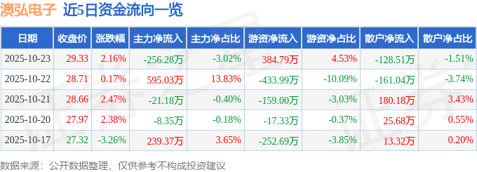 证券之星消息,截至2025年10月23日收盘,澳弘电子(605058)报收于29.33元,上涨2.16%,换手率2.04%,成交量2.92万手,成交额8490.07万元。