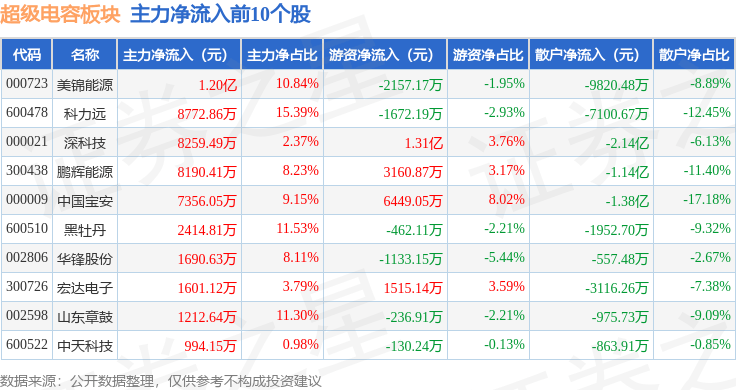 从资金流向上来看,当日超级电容板块主力资金净流入1.16亿元,游资资金净流入2.7亿元,散户资金净流出3.87亿元。超级电容板块个股资金流向见下表: