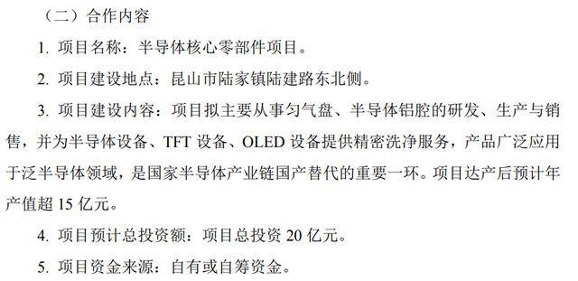 该项目拟主要从事匀气盘、半导体铝腔的研发、生产与销售,并为半导体设备、TFT设备、OLED设备提供精密洗净服务,产品广泛应用于泛半导体领域,是国家半导体产业链国产替代的重要一环。项目达产后预计年产值超15亿元,项目总投资额20亿元。