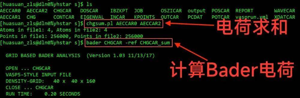 用两个脚本,第一个叫 chgsum.pl,后面接这个 AECCAR0 和 AECCAR2,就是把 0 和 2 的电荷信息加起来,其中 0 是芯部电子, 2 是价电子的,得到一个总电子的分布情况,加完之后得到一个CHGCAR_sum。然后下一个命令就是bader CHGCAR -ref 读取电荷文件,接下来再是CHGCAR_sum来处理这个原子的电子情况,也就是bader电荷。