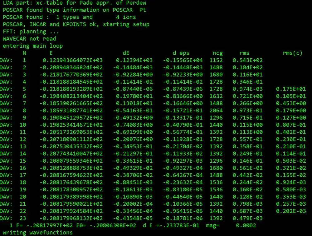 那么对于Bader电荷还需要加一个LAECHG=.T. 输出一些原子芯部和价电子的信息,可以用Bader脚本进行处理,其他参数不用修改,保存提交任务。这些就是刚才说的芯部电子和价电子输出的一些信息,这个地方就是常规的自洽计算,它算完之后还会输出一些电荷的一些数字,最后它会汇总到几个文件中,就处理那几个文件就可以。现在自洽计算已经完成了,算完之后它会输出这AECCAER0、AECCAR 1、AECCAR2 三个文件。