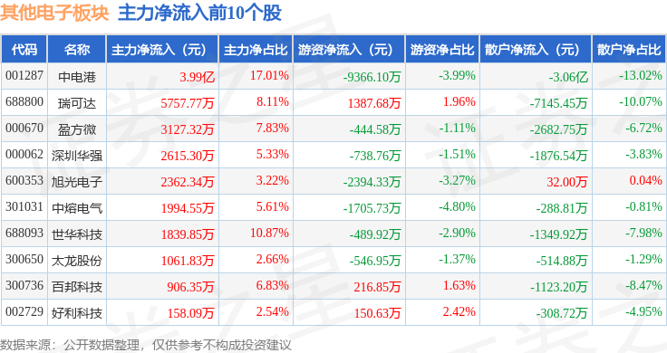 从资金流向上来看,当日其他电子板块主力资金净流入2038.87万元,游资资金净流入5927.72万元,散户资金净流出7966.59万元。其他电子板块个股资金流向见下表: