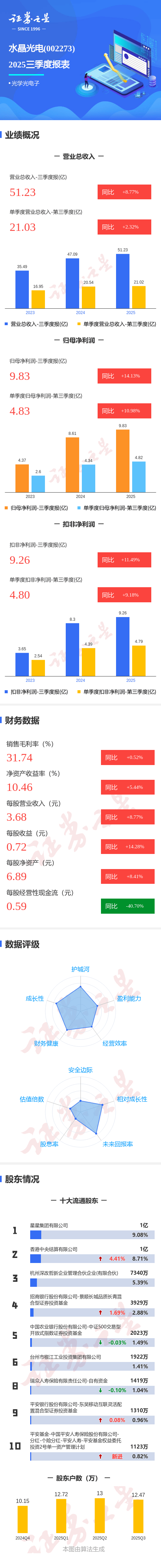 证券之星消息,水晶光电2025年三季报显示,公司主营收入51.23亿元,同比上升8.78%;归母净利润9.83亿元,同比上升14.13%;扣非净利润9.26亿元,同比上升11.5%;其中2025年第三季度,公司单季度主营收入21.03亿元,同比上升2.33%;单季度归母净利润4.83亿元,同比上升10.98%;单季度扣非净利润4.8亿元,同比上升9.18%;负债率18.62%,投资收益9236.63万元,财务费用-3052.89万元,毛利率31.74%。