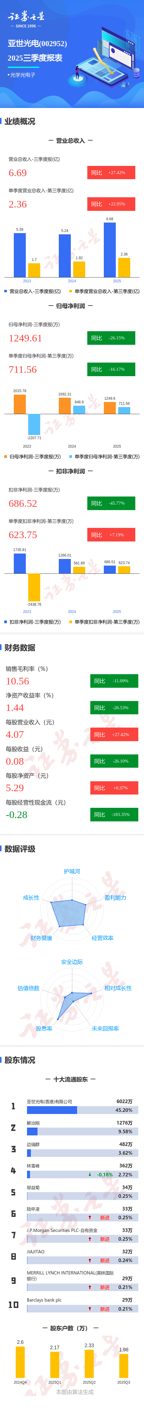 证券之星消息,亚世光电2025年三季报显示,公司主营收入6.69亿元,同比上升27.43%;归母净利润1249.61万元,同比下降26.16%;扣非净利润686.52万元,同比下降45.77%;其中2025年第三季度,公司单季度主营收入2.36亿元,同比上升22.96%;单季度归母净利润711.56万元,同比下降16.18%;单季度扣非净利润623.75万元,同比上升7.19%;负债率22.46%,投资收益271.28万元,财务费用317.39万元,毛利率10.56%。