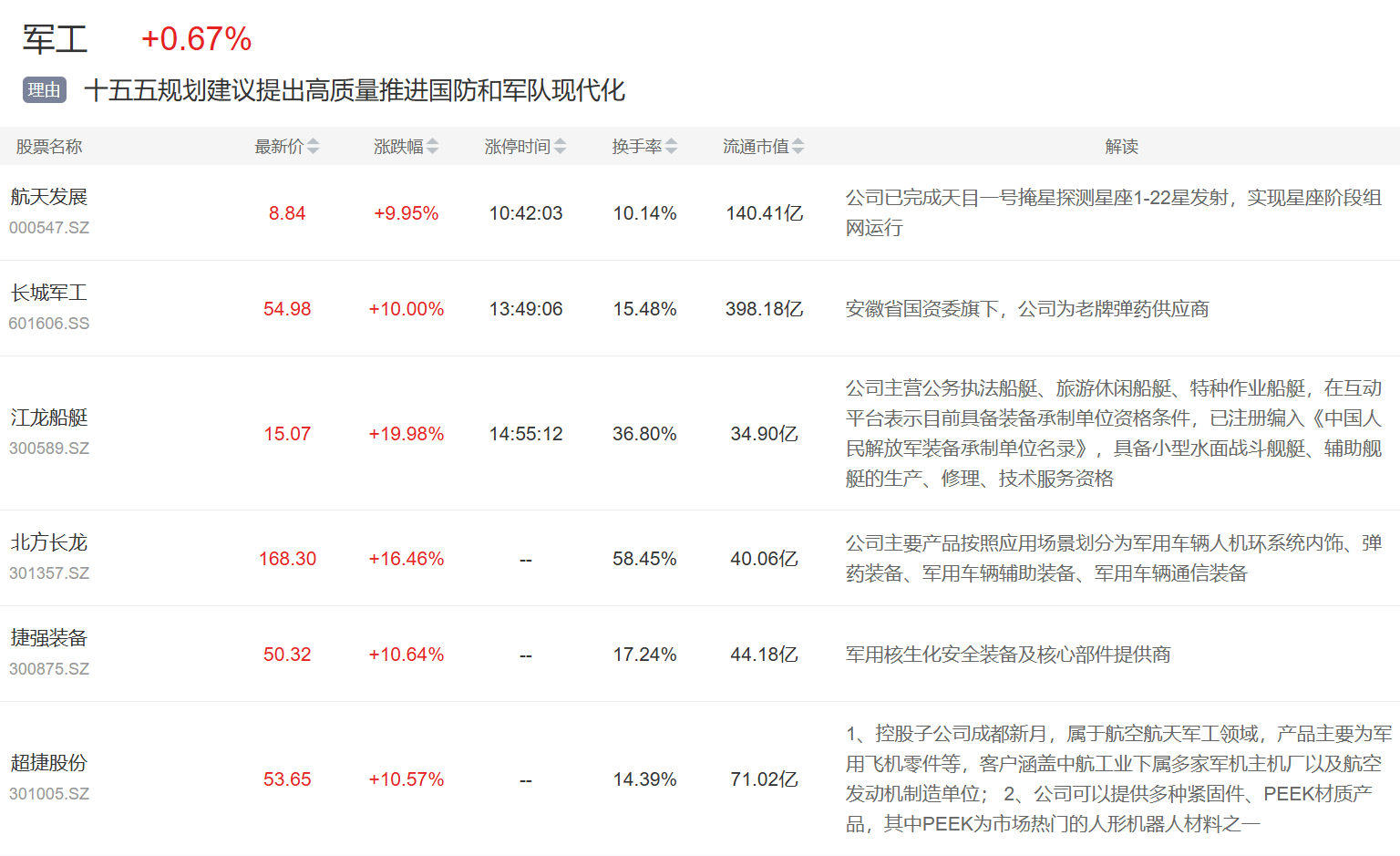 军工板块今日反弹,航天发展、长城军工、江龙船艇等涨停。