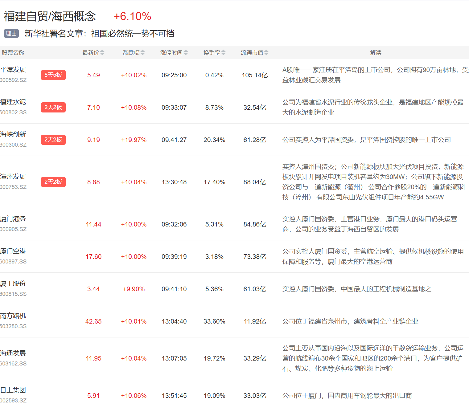 福建自贸概念今日继续强势,平潭发展4连板,福建水泥、海峡创新、漳州发展等连板。