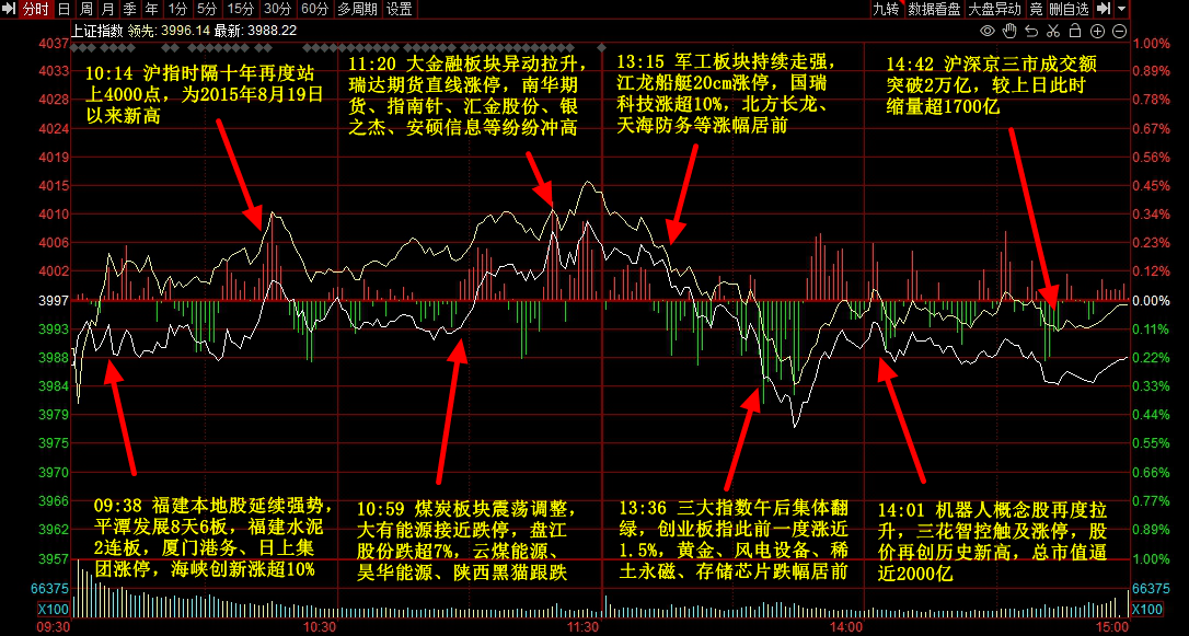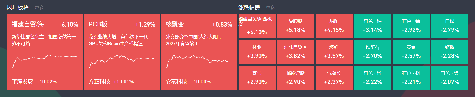 沪指全天窄幅震荡,盘中一度站上4000点,再创十年多以来新高,创业板指冲高回落。福建本地股延续强势,海峡创新、福建水泥等十余股涨停。军工板块集体爆发,江龙船艇、长城军工等多股封板。PCB、CPO等算力硬件股活跃,方正科技、景旺电子等涨停。下跌方面,黄金、有色板块下挫,铜陵有色跌停。个股跌多涨少,沪深京三市近4000股飘绿,今日成交2.16万亿。