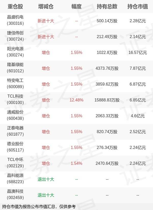 证券之星消息,10月28日天弘基金旗下祁世超管理的天弘中证光伏产业指数型发起式基金公布三季报,近1年净值增长率5.64%。与上一季度相比,该基金前十大重仓股新增晶盛机电,捷佳伟创;并对阳光电源增仓15.57万股,为该基金第一大重仓股;晶科能源,晶澳科技等退出前十大重仓股;详细数据如下: