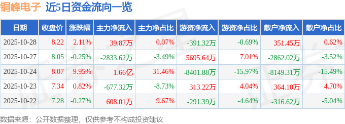 证券之星消息,截至2025年10月28日收盘,铜峰电子(600237)报收于8.22元,上涨2.11%,换手率11.2%,成交量69.61万手,成交额5.66亿元。