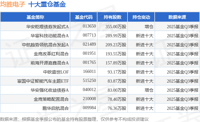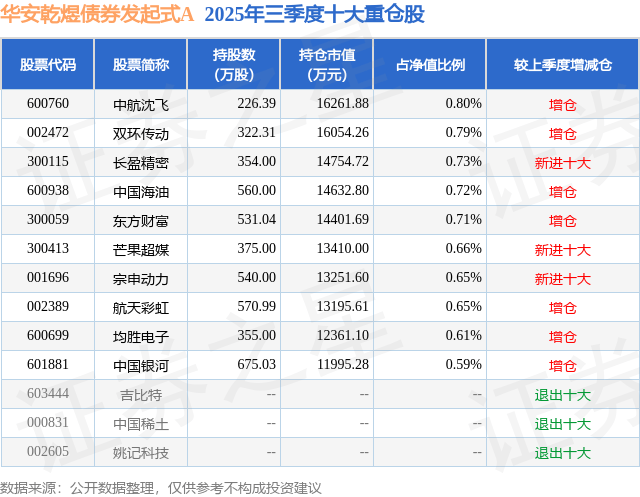 根据2025基金Q3季报公募基金重仓股数据,重仓该股的公募基金共48家,其中持有数量最多的公募基金为华安基金的华安乾煜债券发起式A。华安乾煜债券发起式A目前规模为149.22亿元,最新净值1.1896(10月28日),较上一交易日上涨0.01%,近一年上涨9.5%。该公募基金现任基金经理为郑伟山 邹维娜 倪逸芸。邹维娜在任的基金产品包括:华安沣信债券A,管理时间为2023年7月18日至今,期间收益率为13.1%。郑伟山在任的基金产品包括:华安新乐享灵活配置混合A,管理时间为2022年5月25日至今,期间收益率为12.3%;华安强化收益债券A,管理时间为2022年9月16日至今,期间收益率为35.91%;华安添颐混合A,管理时间为2023年3月23日至今,期间收益率为11.32%。倪逸芸在任的基金产品包括:华安安浦债券A,管理时间为2025年6月4日至今,期间收益率为0.25%;华安沣信债券A,管理时间为2025年6月4日至今,期间收益率为4.35%;华安添顺债券,管理时间为2025年6月4日至今,期间收益率为0.31%。