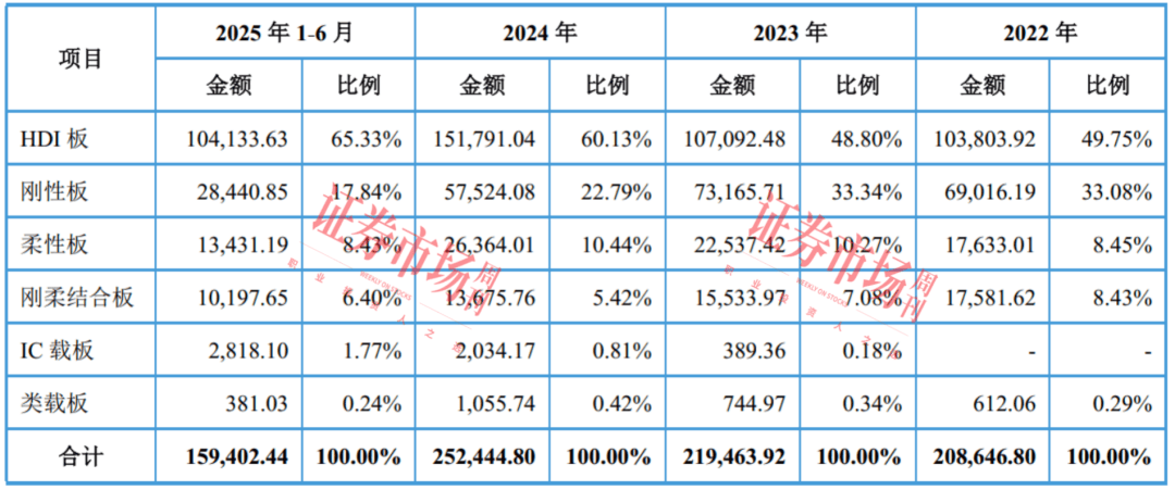 红板科技是专注于印制电路板的研发、生产和销售的企业, 其产品包括HDI板(高密度互连印制电路板)、刚性板、柔性板、刚柔结合板、类载板、IC载板(直接用于搭载芯片的印制电路板)等。 其中,HDI板和刚性板是核心产品,但两者近年收入贡献反向而行。 其中,HDI板由2022年的49.75%提升至2025年1-6月的65.33%;刚性板的收入占比由2022年的33.08%下降至2025年1-6月的17.84%。从产品的收入结构变化看,HDI板是红板科技近年发展的主要方向。