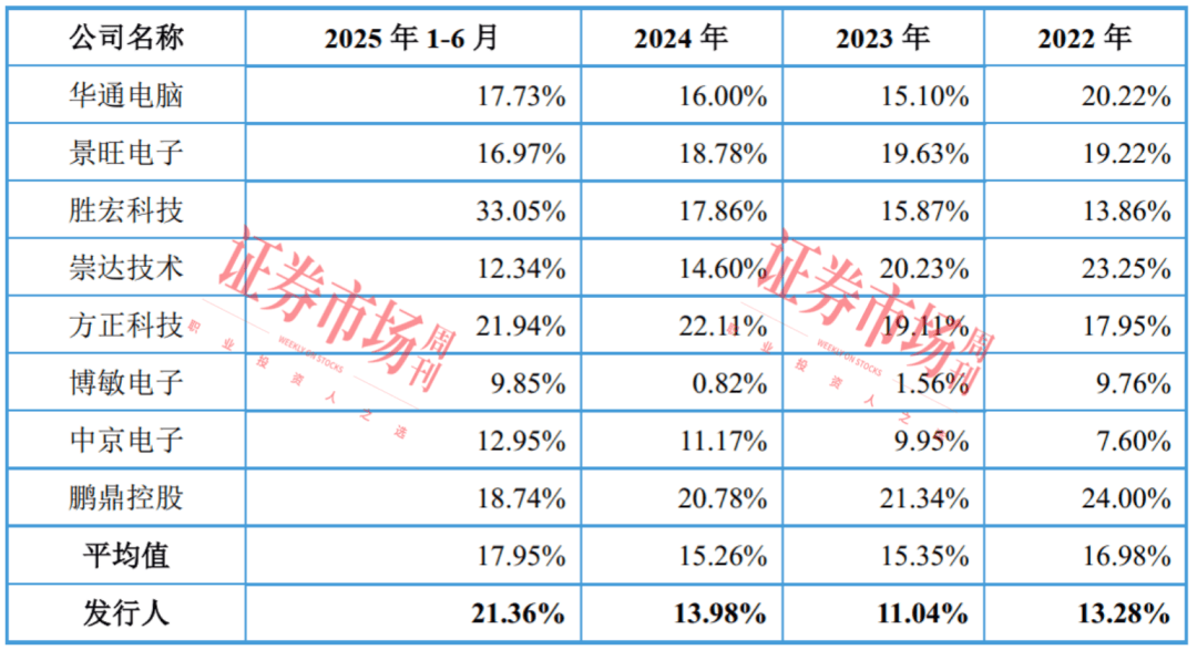 在招股书中,红板科技选择了华通电脑、景旺电子、胜宏科技、崇达技术、方正科技、博敏电子、中京电子、鹏鼎控股8家上市公司作为同行业可比公司。 从毛利率与同行业可比公司的对比数据来看,8家同行业公司毛利率均值分别为16.98%、15.35%、15.26%和17.95%。从对比结果看,前三年红板科技毛利率低于行业均值,2025年1-6月的毛利率超过行业均值。