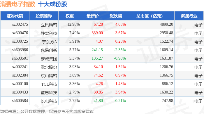 消费电子(980030)指数十大成份股详情如下: