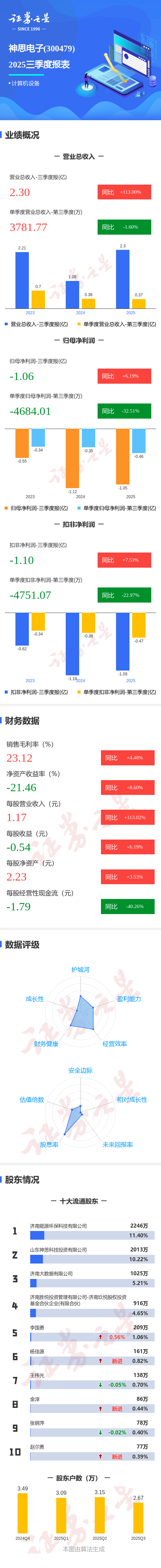 证券之星消息,神思电子2025年三季报显示,前三季度公司主营收入2.3亿元,同比上升113.0%;归母净利润-1.06亿元,同比上升6.2%;扣非净利润-1.1亿元,同比上升7.54%;其中2025年第三季度,公司单季度主营收入3781.77万元,同比下降1.61%;单季度归母净利润-4684.01万元,同比下降32.51%;单季度扣非净利润-4751.07万元,同比下降22.98%;负债率56.63%,财务费用159.76万元,毛利率23.12%。