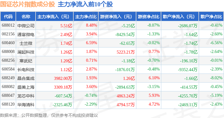 资金流向方面,国证芯片(980017)指数成份股当日主力资金净流出合计56.22亿元,游资资金净流入合计29.17亿元,散户资金净流入合计27.05亿元。成份股资金流向详情见下表: