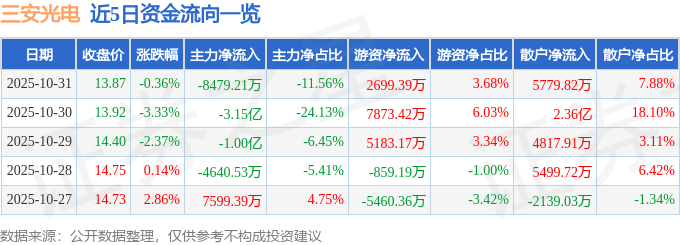 证券之星消息,截至2025年10月31日收盘,三安光电(600703)报收于13.87元,下跌0.36%,换手率1.06%,成交量52.67万手,成交额7.33亿元。