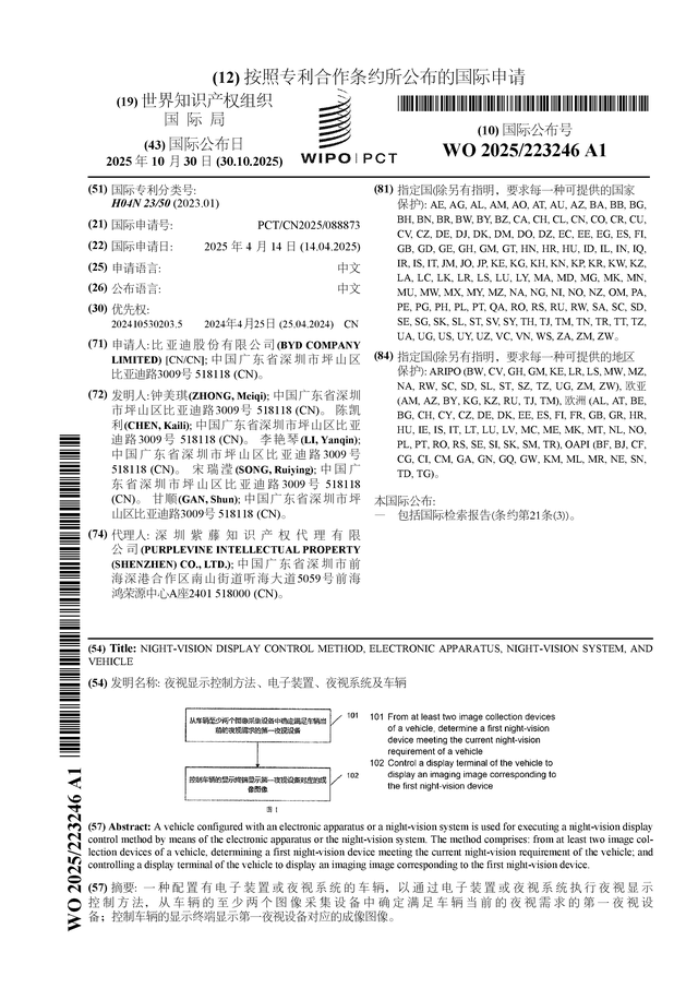 证券之星消息,根据企查查数据显示比亚迪(002594)公布了一项国际专利申请,专利名为“夜视显示控制方法、电子装置、夜视系统及车辆”,专利申请号为PCT/CN2025/088873,国际公布日为2025年10月30日。