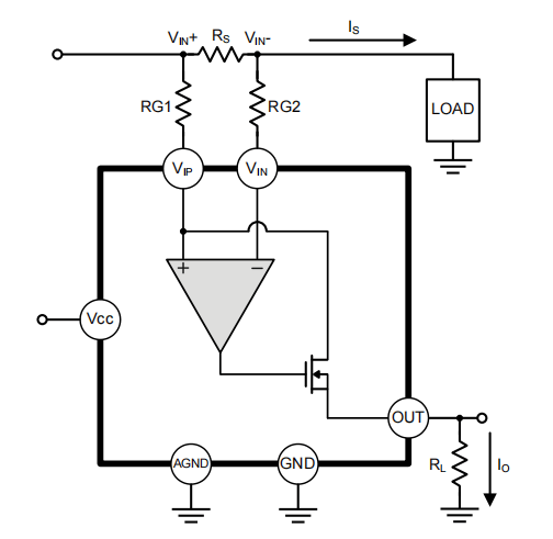 FP135通过测量负载电流在检测电阻上产生的压差进行工作:内部差分放大器将压差放大,并通过MOSFET以源极跟随形式,输出一个与负载电流严格成线性比例的电压信号。有三个外部电阻,可以通过改变这三个外部电阻器的值来调整增益。