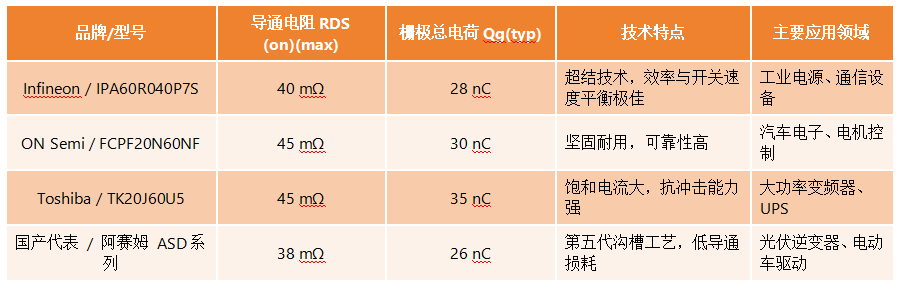 方案:优先选择低Qg和低RDS(on)的型号以降低开关损耗和导通损耗,提升整机效率。超结MOS管(SJ-MOSFET)是该领域的主流选择。