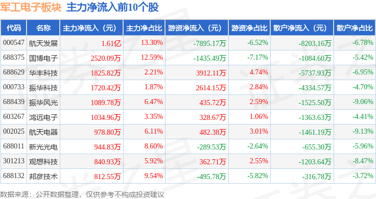 从资金流向上来看,当日军工电子板块主力资金净流出9.0亿元,游资资金净流入5.49亿元,散户资金净流入3.52亿元。军工电子板块个股资金流向见下表: