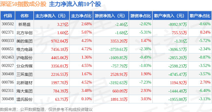 资金流向方面,深证50(399850)指数成份股当日主力资金净流出合计105.31亿元,游资资金净流入合计27.73亿元,散户资金净流入合计77.58亿元。成份股资金流向详情见下表: