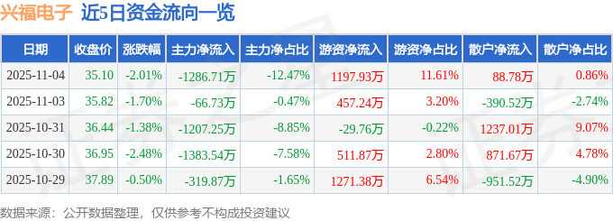 证券之星消息,截至2025年11月4日收盘,兴福电子(688545)报收于35.1元,下跌2.01%,换手率4.02%,成交量2.93万手,成交额1.03亿元。