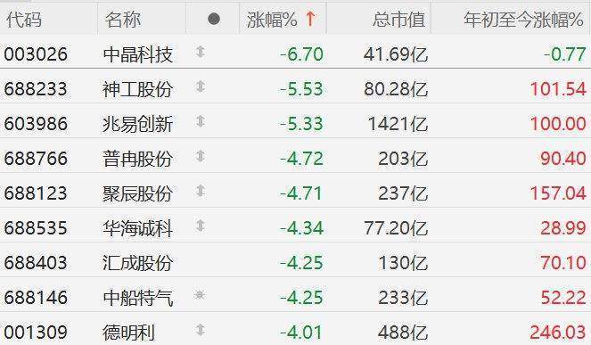 格隆汇11月5日|A股市场半导体股集体下跌,其中,中晶跌超6%,神工股份、跌超5%,普冉股份、聚辰股份、华海诚科、汇成股份、中船特气、德明利跌超4%。