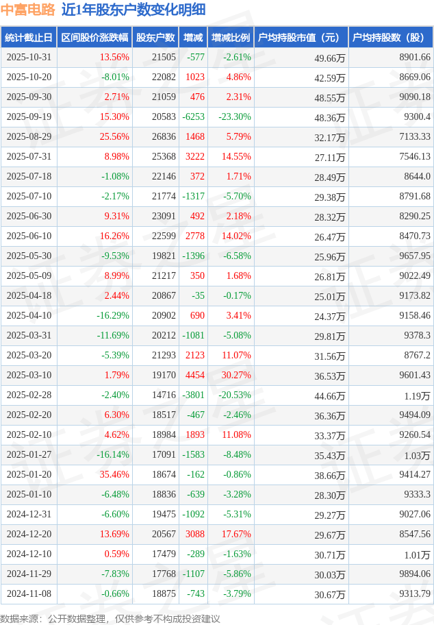 从股价来看,2025年10月20日至2025年10月31日,中富电路区间涨幅为13.56%,在此期间股东户数减少577.0户,减幅为2.61%。