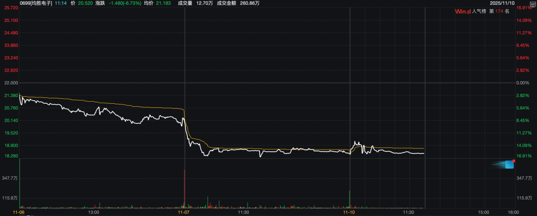 汽车零部件供应商均胜电子(A股600699.SH、港股00699.HK)也难逃破发命运。